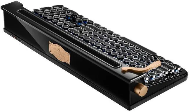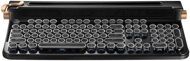Stow your devices in the integrated stand to type for extended periods without straining your neck. ^^ Left lever Crafted from solid aluminum, the left lever functions as an Enter key, reminiscent of old typewriters. Relive the charm of typewriting like its 1874. ^^ Left wheel The left wheel, crafted from solid aluminum, adjusts the brightness of the clean and sharp white LED backlight with precision. ^^ Right wheel The right wheel, also made from solid aluminum, allows seamless volume control of the connected device. Adjust sound levels effortlessly without touching the device.