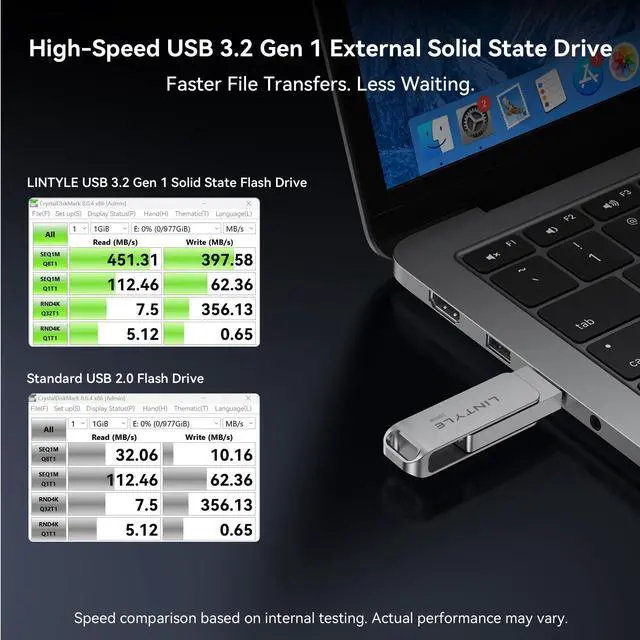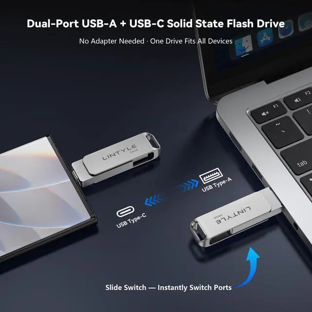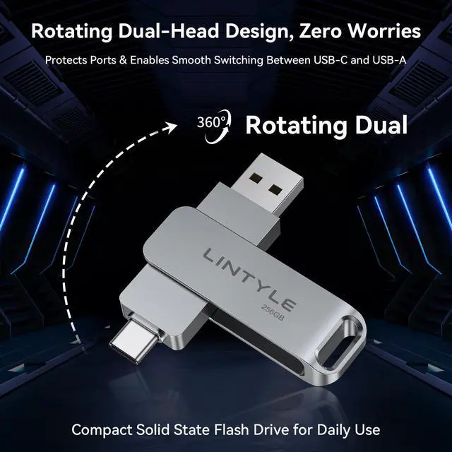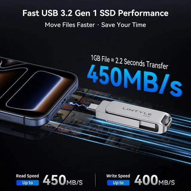 1. Dual USB-C & USB-A Flash Drive Design Designed as a dual USB flash drive, the LINTYLE usb c flash drive features both USB-C and USB-A ports, allowing seamless data transfer between phones and computers. This USB C USB A flash drive works perfectly as a phone flash drive USB-C, making it easy to move photos, videos and files without adapters. ^^ 2. USB 3.2 Gen 1 External SSD Speed Up to 450MB/s Powered by USB 3.2 Gen 1 technology, this external solid state drive delivers read speeds up to 450MB/smuch faster than traditional USB memory sticks.