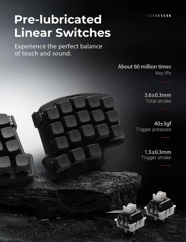 ^^ Hot-swappable custom keyboard: Suitable for 3/5-pin mechanical switches (supports Cherry MX switches), built-in 2-in-1 puller, easy to replace mechanical switches or keycaps. Pre-lubricated linear switches, with a trigger pressure of only 40g, have fast response and save effort, making them ideal for long-term typists and software engineers.