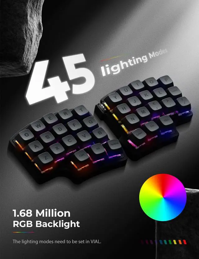 ^^ RGB backlight: About 16.8 million RGB colors, you can enter VIAL to adjust the light color, brightness, speed, built-in rainbow, breathing, rhythmic light 45 preset light modes for you to choose, creating a perfect atmosphere for your typing experience, even in low light environments, you can easily identify the keys.