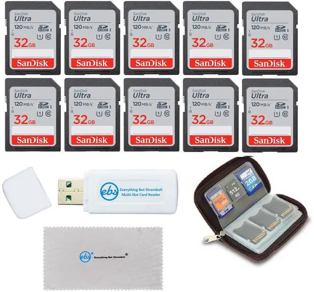 Compatible in any Sony, Canon, Nikon, Panasonic, Fujifilm, Olympus, and Kodak cameras with an SDHC card slot. This bundle also makes a great gift for hunters who use trail cams such as Moultrie, Spypoint, Browning, Covert, Cuddeback, FirstCam, Muddy, Stealth Cam, Spartan, Spypoint, and Wildgame trail cameras with an SDHC card slot. Bundle includes (10) 32 GB Ultra Memory Cards SDHC (SanDisk - 120MB/s) and (1) Everything But Stromboli Combo Card Reader (Includes SD, Micro SD, M2, and MS slots for easy transfer) and (1) MicroFiber Cloth, and (1) Memory Card Wallet for SD, CF, TF Micro cards (8 pages with 20 slots)