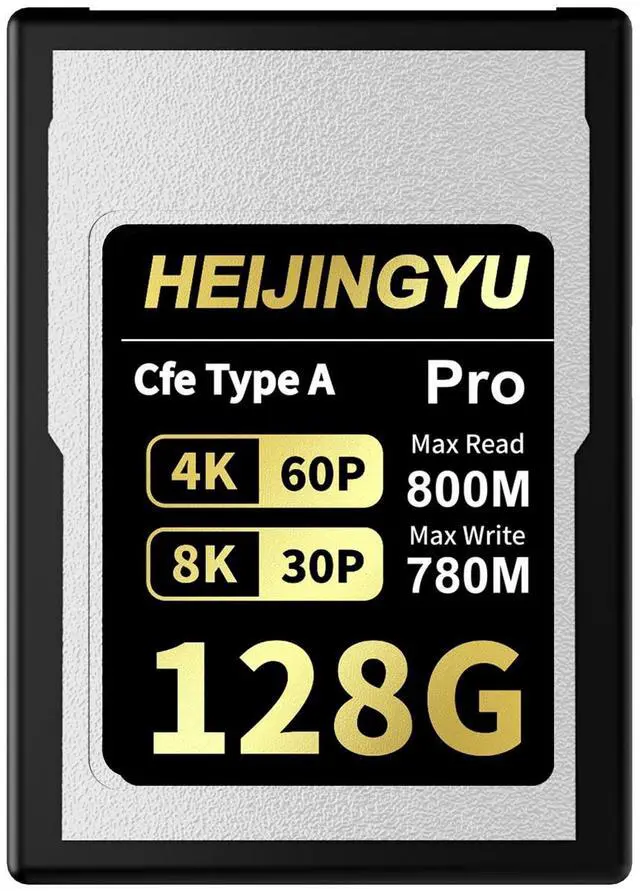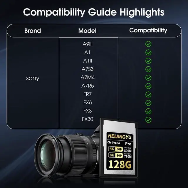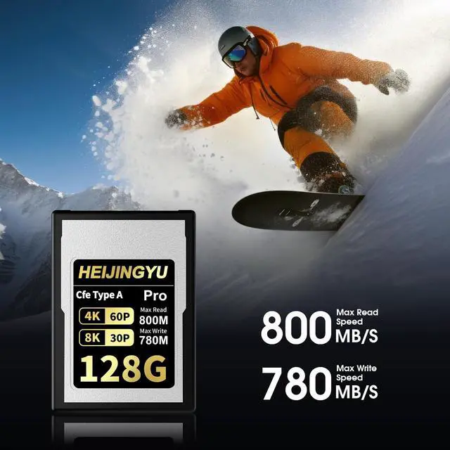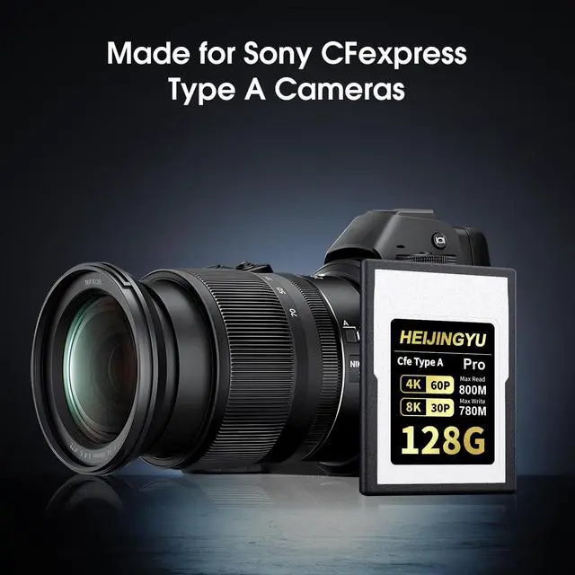 Large Capacity, Continuous Recording at 4K/8K HEIJINGYU 128GB CFexpress Type A memory card, specially designed for high resolution video recording, for continuous recording up to 8K RAW. ^^ Stable Performance HEIJINGYU 128GB CFexpress Type A card provides maximum read speeds of up to 800MB/s and write speeds up to 780MB/s, with a sustained write speed of 390MB/s. Speeds are based on internal testing. Actual transfer rates and capacity may vary depending on host device, file attributes, system hardware, and other factors. ^^ Compatible with Sony Alpha & FX CamerasHEIJINGYU 128GB CFexpress Type A Card has been approved for Sony A9III, A1, A1II, A7S3, A7M4, A7R5, FR7, FX6, FX3 and FX30 cameras.