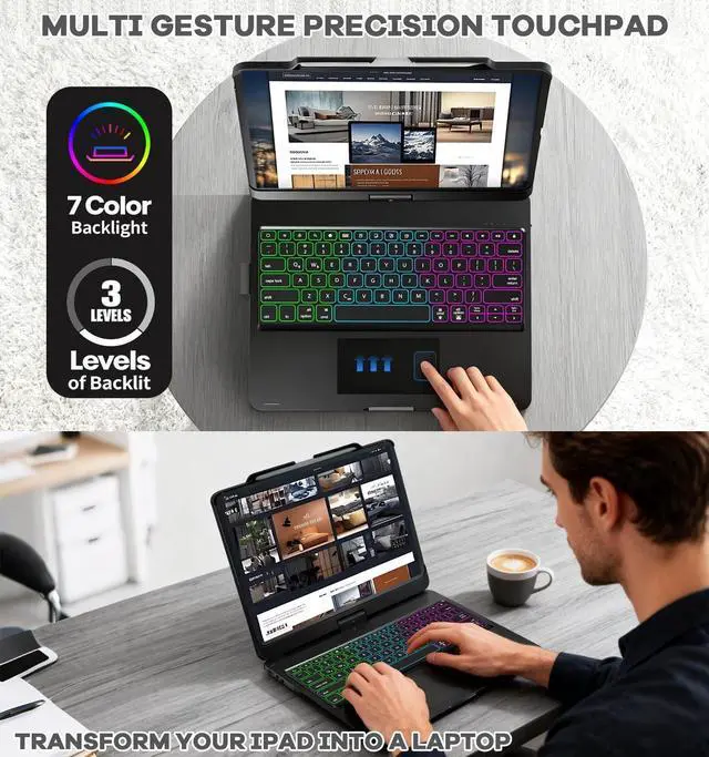 Please confirm the model of your device before purchasing. ^^ Built-in Multi Touchpad ipad air 13 inch case keyboard has a responsive multi-touch trackpad, supporting laptop gestures. ipad pro 12.9 case with keyboard lets you browse, edit docs, or join meetings smoothly without a mouse, turning your iPad into a laptop-like device for better productivity. Press FN+T to turn it ON/OFF and avoid accidental touchesideal for students, pros, and creatives. ^^ Rainbow Backlightipad pro 13 inch case with keyboard features vibrant backlightingavailable in rainbow options, with 3 adjustable brightness levels.