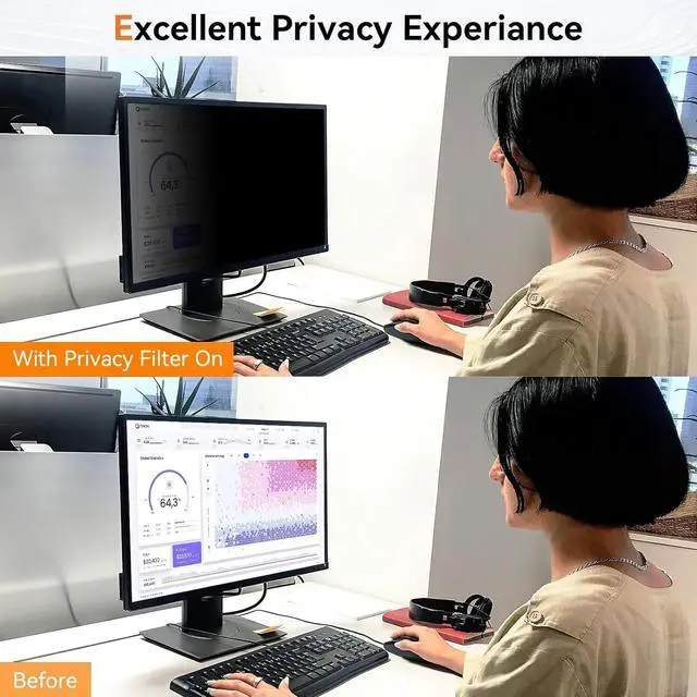 ^^ WIDELY APPLICABLEThis premium desk privacy screen film delivers optimal privacy protection for public spaces, offices, classrooms, libraries, subway stations, hospitals, financial institutions, and business conferences. Its precision-engineered cutouts and full-coverage design ensure a comfortable, glare-free viewing experience.