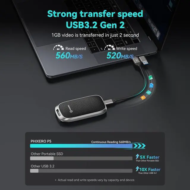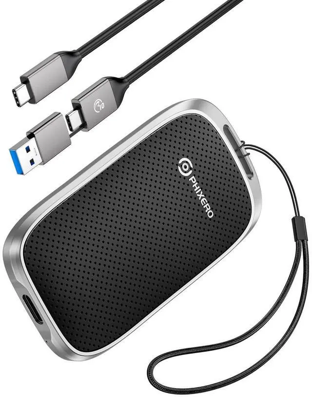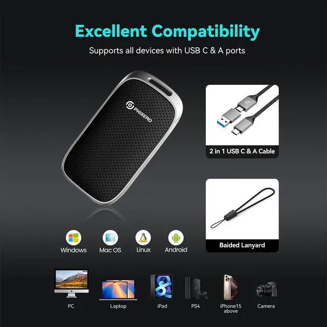 Your data stays safe no matter where you go ^^ Ultra-Portable Design with Free LanyardCompact 3.28 x 1.73 x 0.47 inches size fits effortlessly in pockets, purses, or backpacks. The built-in lanyard hole comes with a free durable lanyard includedeasily attach it to keys, bags, or gear for on-the-go convenience. No extra accessories needed ^^ 2-in-1 Data Cable IncludedComes with both USB C to C and USB C to A cables, ensuring seamless compatibility with all devicesnew MacBook/iPad Pro (USB C), old laptops (USB A), PS5, Xbox, Android phones, and moreno extra adapters needed ^^ 5-Year Warranty & Reliable SupportEnjoy peace of mind with our industry-leading 5-year warranty, covering manufacturing defects and technical issues.