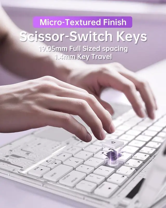 Display shows battery, Bluetooth, Caps Lock status. ^^ Pencil Holder & Battery Magnetic holder supports Pencil storage and wireless charging. 1.2 lbs, 0.8" slim, Type-C fast charge, 100-day standby. ^^ 1-Year Warranty & 24/7 Support Offers 1-year warranty and 24/7 customer support. Contact us anytime with order issues for a reply within 2 hours.
