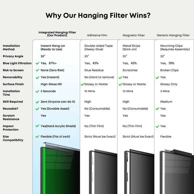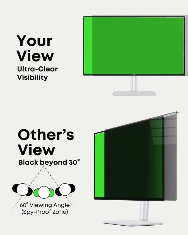Visible Zone: Keeps your screen content private with a strict 30 viewing angle. Blocks 50% of screen at 20, 80% at 30, and 100% beyond 30, safeguarding sensitive information from onlookers in office or public environments. ^^ Removable & Tool-Free Hanging Design, Instant