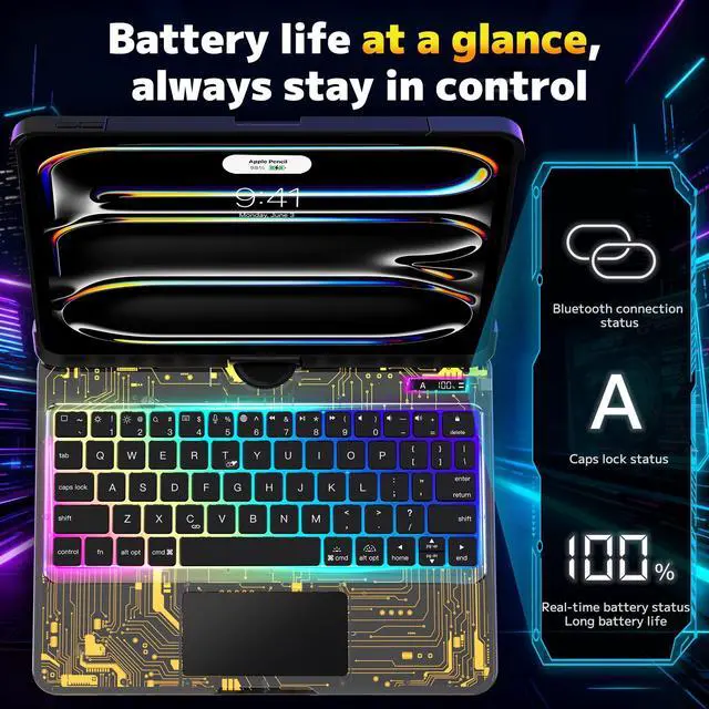 ^^ Comfortable Typing and Stylish DesignThe iPad Pro 11-inch Keyboard Case features skin-friendly, silent keys, making typing comfortable and effortless, reducing fatigue even after prolonged use. It also boasts multi-color backlighting with soft, non-glaring light, combining cool practicality with a stylish look. ^^ Fast Charging & Long Battery LifeIt only takes 2 hours to fully charge and is designed for long battery life. No need to frequently plug and unplug the charging cable, completely say goodbye to battery anxiety, and keep your iPad Case with Keyboard in high-efficiency use at all times.