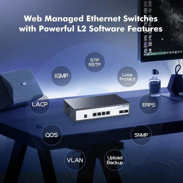 L2 configurations: such as VLAN, QoS, security, multicast, MAC address table, Link Aggregation, LACP, Port Mirroring/Isolation/Rate-limit/Security, Storm Control, Spanning Tree, diagnosis/Ping, SNMP, etc.