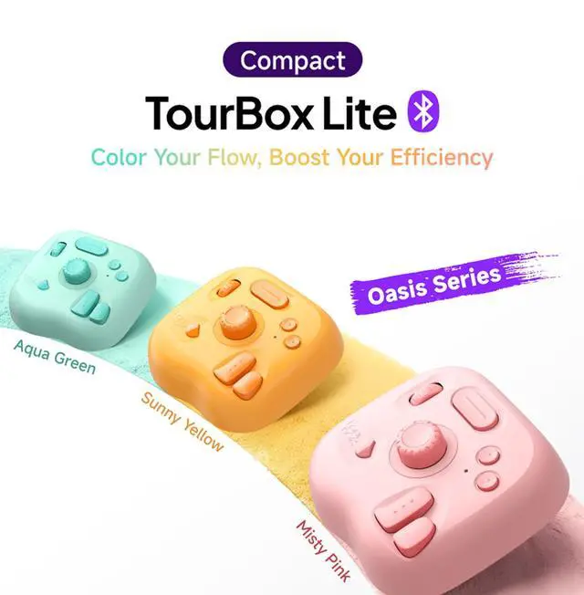 Meet the TourBox Lite Oasis Series. Designed to bring a splash of color and inspiration to your workspace, this compact controller now features vibrant, soothing color options to fuel your creativity. Beyond its inspiring hues, it delivers the same cable-free flexibility with Bluetooth connectivity for laptop, desktop, or Win tablet setups. With a compact, ergonomic design and intuitive control layout, it remains the smarter, more comfortable way to create. Enjoy the same seamless integration with top creative softwares, smart preset auto-switching, and custom macro controlperfect for illustration, light editing, and daily digital workflows.