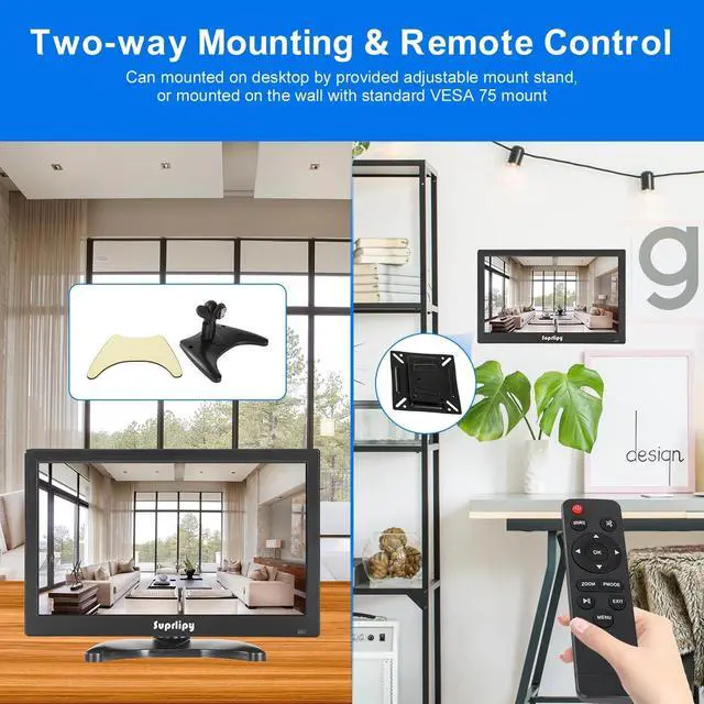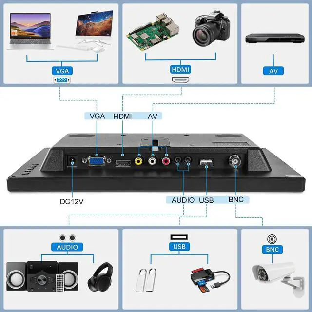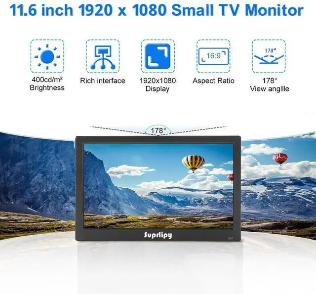 FHD 1080P Small MonitorElevate your viewing experience with the Suprlipy 12" FHD IPS monitor, boasting a crisp 1920x1080 resolution. With a 16:9 aspect ratio and a 178 wide viewing angle, this small monitor offers a broader perspective, making it ideal for both professional work and personal media consumption. ^^ Muiti-device CompatibilityWith its comprehensive support for HDMI, AV, BNC, VGA, and USB inputs, this 12 inch monitor is the ultimate addition to your home or office. It effortlessly handles gaming, video editing, security monitoring, and everyday computing tasks, offering a dependable and robust connection across the board.