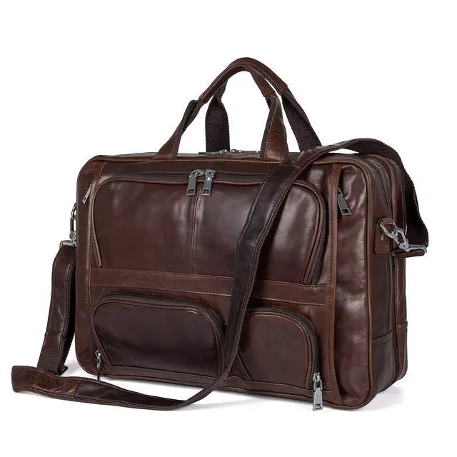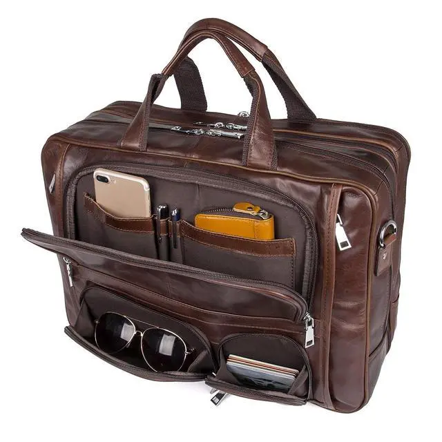 ^^ Capacity: three zippered pockets in front, can fit your small belongings, three zippered pockets at the top, middle compartment fit up to 17.3" Laptop, padded laptop compartment fit 16" Laptop, other two compartments can hold, for example, PAD, books, glasses, phone, wallet and clothes for short trips; this leather briefcase with large capacity for all your business needs.