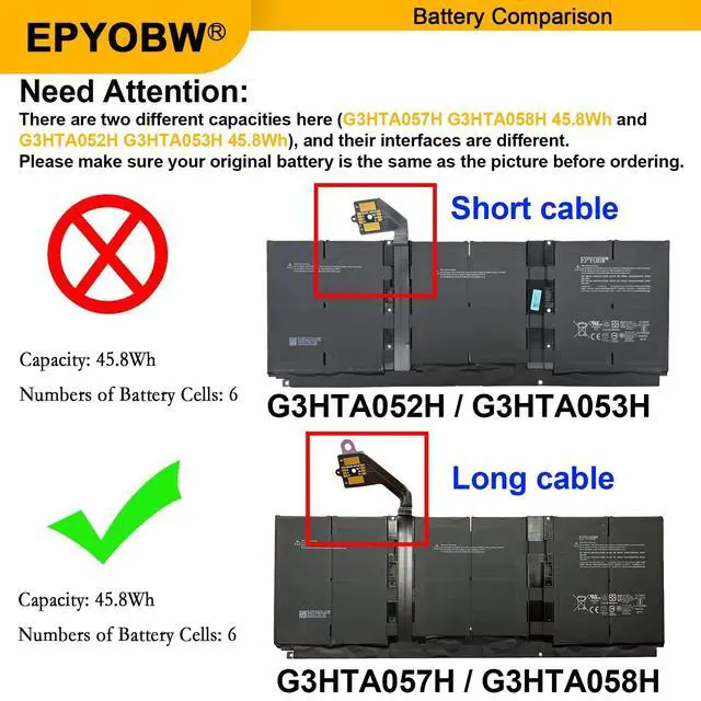 (Note: There are two different capacities here (G3HTA057H G3HTA058H 45.8W h and G3HTA052H G3HTA053H 45.8W h), and their interfaces are different. You can open the back of the laptop to check the original battery model. Please make sure your original battery is the same as the picture before ordering. ) ^^ Purchase Skills Please open the back cover of the laptop before ordering and make sure that the original battery model is consistent with the listing. After getting the battery, please install the battery correctly, make sure that the battery connector is firmly connected to the laptop motherboard, and use the original charger to charge the laptop. Discharge the new battery to 5% (not 0%), then charge and cycle 3-4 times to wake up the new battery. ^^ EPYOBW Promise All EPYOBW's batteries are certificated by UL/CE/FCC/RoHS. Our batteries are tested by strict quality control standards to ensure that the capacity is true, stable current, low self-discharge. And we also have short circuit, overheat, and overload protections. We are confident in the performance of replacement batteries and professional service.