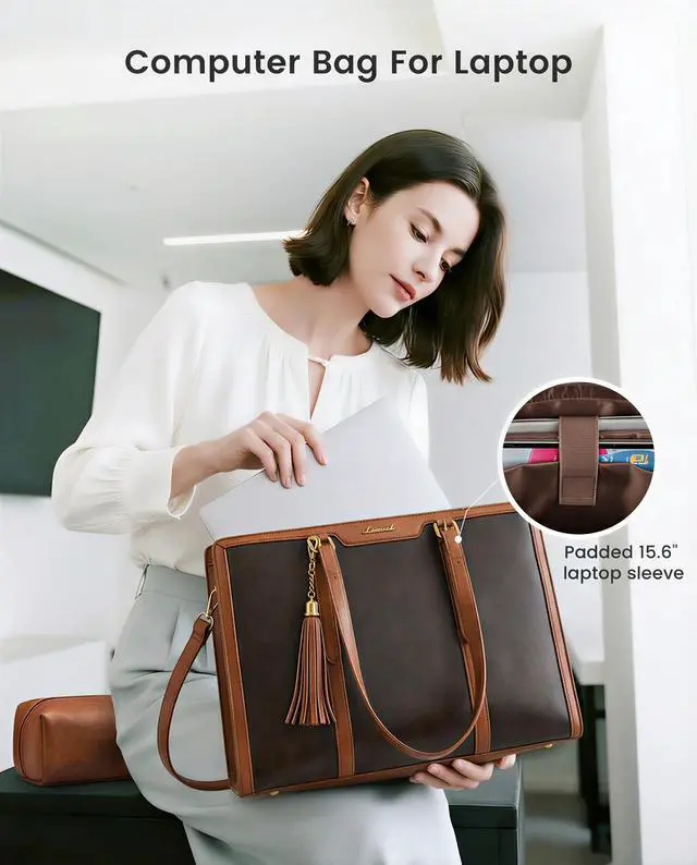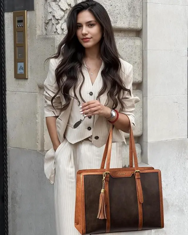 • Elegant Laptop Tote Bag & Stand Upright This laptop bag for women combines vintage charm with modern fashion, making it a classic accessory that never goes out of style. Its metal feet ensure that the work bag stands upright and maintains its shape, adding to its overall sophisticated look.