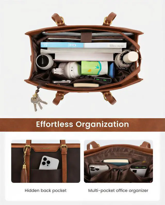 Elegant Laptop Tote Bag & Stand Upright This laptop bag for women combines vintage charm with modern fashion, making it a classic accessory that never goes out of style. Its metal feet ensure that the work bag stands upright and maintains its shape, adding to its overall sophisticated look. ^^ Large Capacity & Multi-Pocket Tote Bag With multiple pockets and compartments, this work bag offers generous storage capacity. Organize and carry all your essential items, such as your laptop, Water bottle, notebooks, pens, and more, with ease and convenience.