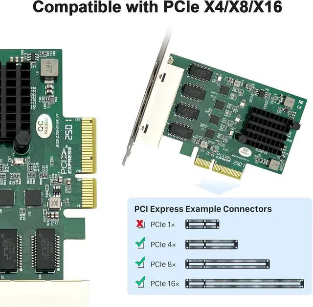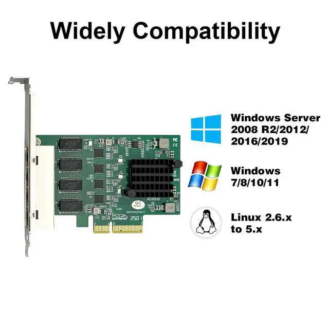 Date Rate100/1000/2500Mbps. NOT support hot swaping ^^ Realtek RTL8125 Ethernet ControllerRealtek RTL8125BG + ASMedia ASM1806 Controller. Compare to 2.5G RTL8125-4T. Quad RJ-45 Port. ^^ System InterfacePCIE 2.1 5GT/sec, x4 Lane compatible with X1/X2/X4/X8/X16 channels. Support PXE, VLAN, Jumbo Frames. Not-support WOL, DPDK, iSCSI, FCoE. ^^ Technical Support1-year Warranty, 30 Days Free-return, Free Lifelong Technical Support. Driver CD Included. ^^ CompatibilityCompatible with Windows 7/8/10/11, Windows Server 2008 R2/2012/2016/2019, Linux 2.6. x to 5. x, Centos 6/7/8, Ubuntu 16/18/19/20, VMware ESXi 6.