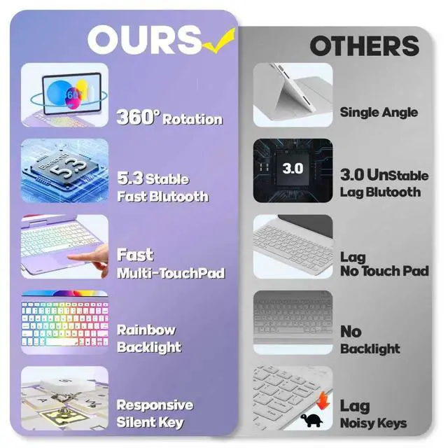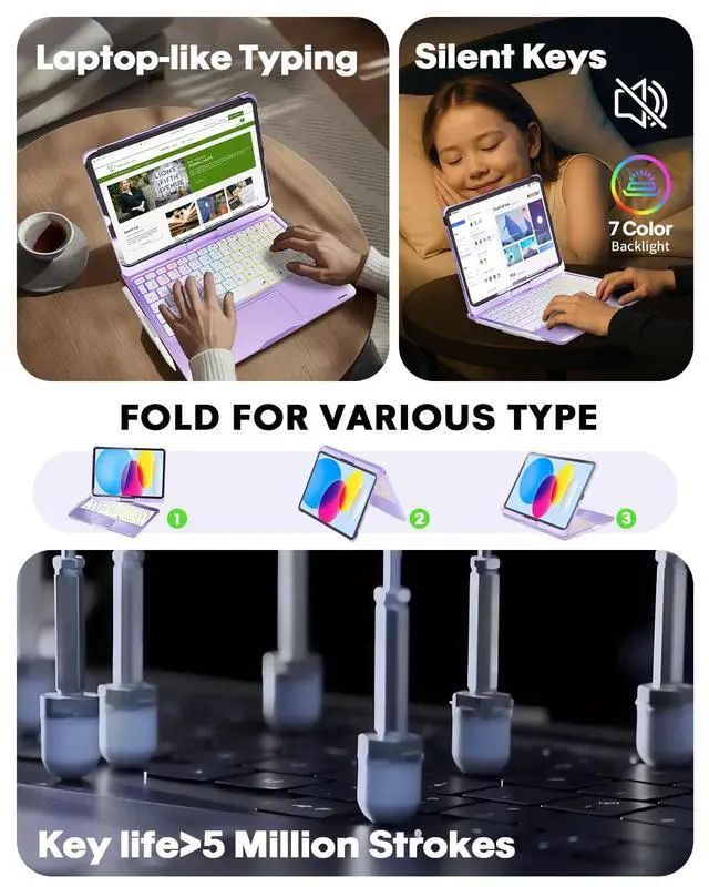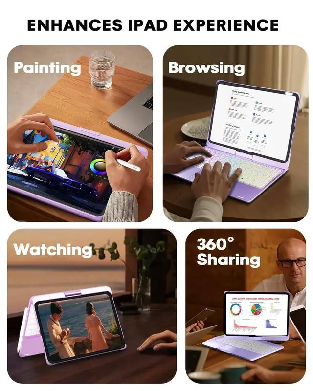 ^^ Responsive Typing & Function KeysiPad 10th generation case with keyboard experience laptop-like typing with responsive keys and a tactile feel. The dedicated function keys let you control brightness, volume, and media playback directly from the keyboard. Ideal for work, study, or entertainment. iPad 10th generation keyboard casePerfect for students, professionals, and creatives who need a seamless typing experience. ^^ Rainbow Backlits&Long BatteryiPad Air 11 inch keyboard with backlits ensures you dont have any trouble while typing in low-lit environment. iPad Air 11 inch keyboard keyboard lights up with different colors and can be turned up brighter or dimmer as needed.