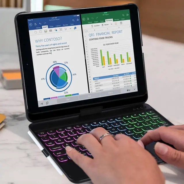 Rotate the screen up to 180 and 360 view angle to effortlessly display your work presentation or watch your favorite show ^^ The backlit keyboard allows you to use your Pad at all hours, day and night. Not to worry if you drift off - the case works with your device's auto sleep/wake function to keep safe all the important things you may be working ^^ Whether you're a blogger, writer, designer, professional or student, The keyboard case offers you a smart, stylish and practical solution to your everyday needs. After a 3 hours charge(charge the keyboard by your Pad Pro USB C cable and wall charger as well, cable is NOT included in this product), you'll be good to go for a full 45 hours of use