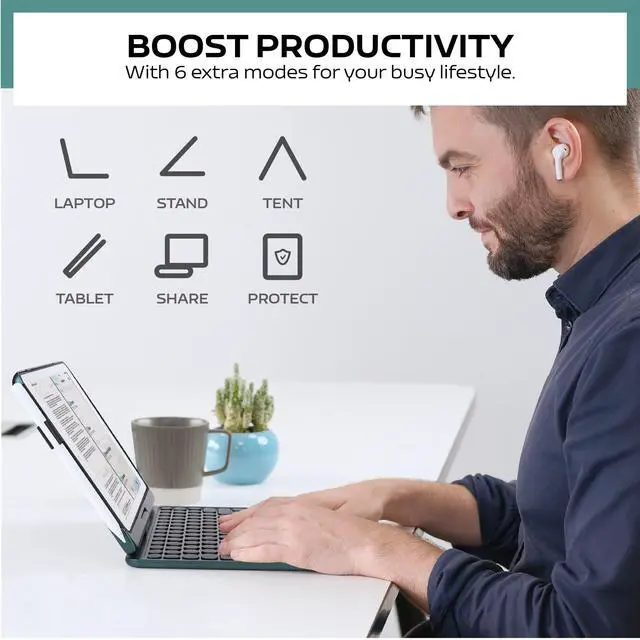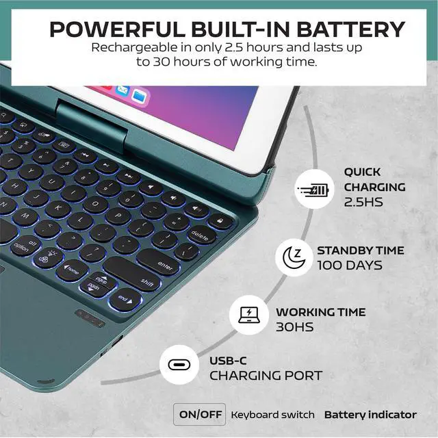 Automatically hibernates/wakes up when iPad is turned on or off ^^ 5.0 Bluetooth & Long-lasting Battery & Built-in Pencil SlotFeaturing Bluetooth chipset version 5.0, which means almost instant connection to your iPad. 2-3 hours fully charged, the wireless keyboard can work for up to 30 hours continuously/standby for 100 days. This 10.9 Air 4 and Air 5 iPad case comes with a pencil clip to prevent loss and make it easy to carry and use