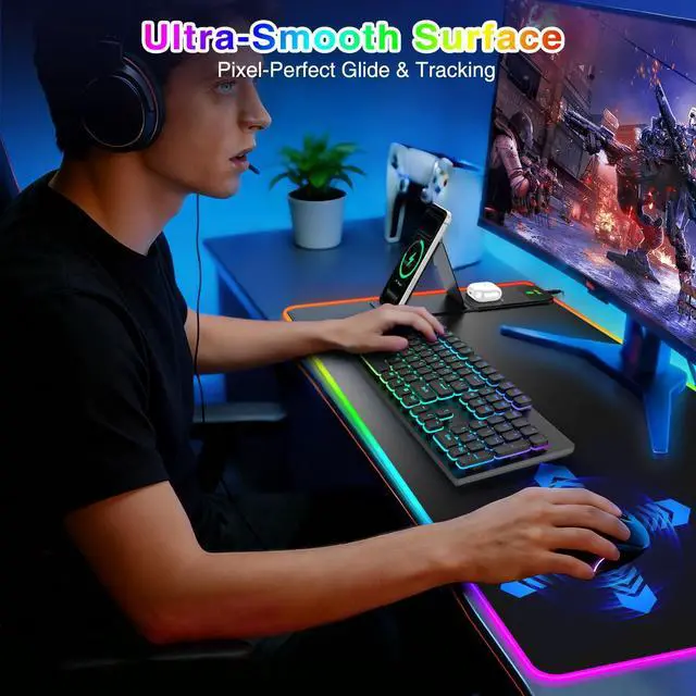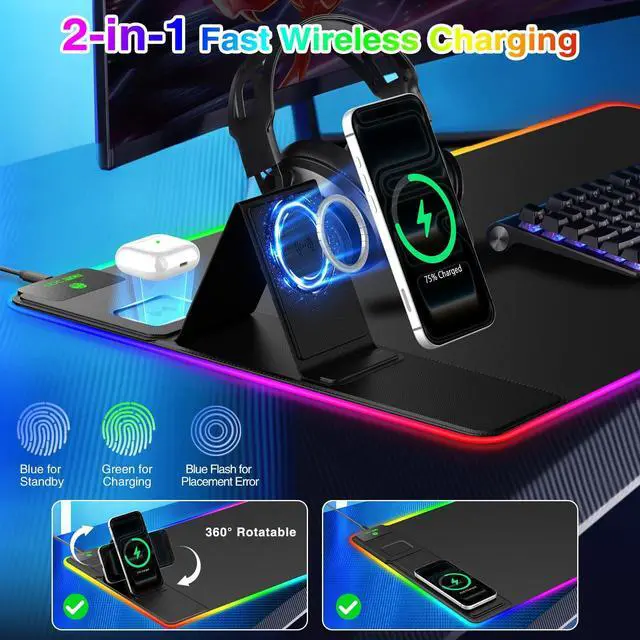 5-in-1 RGB Charging & Gaming Desk Mat 31.5" x 15.8" extra-large mouse pad with 15W fast charging for phone, 5W charging for earbuds, a built-in magnetic phone stand that rotates 360 for perfect viewing, and 25 customizable RGB lighting modesall designed for seamless work, immersive gaming, and hands-free entertainment ^^ Smart Dual-Charging & Wide CompatibilityDelivers up to 15W fast wireless charging to power your phone and earbuds simultaneously. Compatible with iPhone 12-17, Samsung Galaxy S21-S25, AirPods 2/3/4 ANC/Pro/Pro 2/Pro 3, and other Qi-enabled devices ^^ Foldable & Magnetic Phone StandUse it flat for any Qi-enabled device, or snap your iPhone 12-17 (no case or with magsafe case) onto the magnetic stand for hands-free viewing.