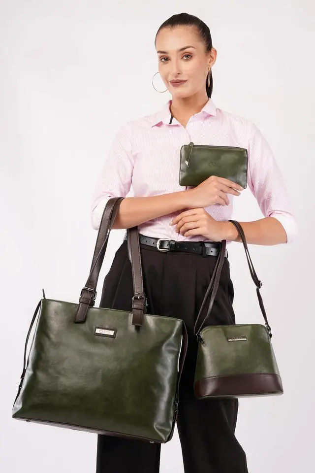 Description Elevate Your Style & Utility All in One Elegant Set Introducing the ECM 3-in-1 Vegan Leather Bag Combo Set a perfect blend of functionality, fashion, and eco-conscious design. Whether you're heading to work, college, a weekend getaway, or a brunch date, this versatile set includes everything a modern woman needs: a Large Laptop Tote, a Stylish Sling Crossbody, and a Matching Cosmetic Pouch.