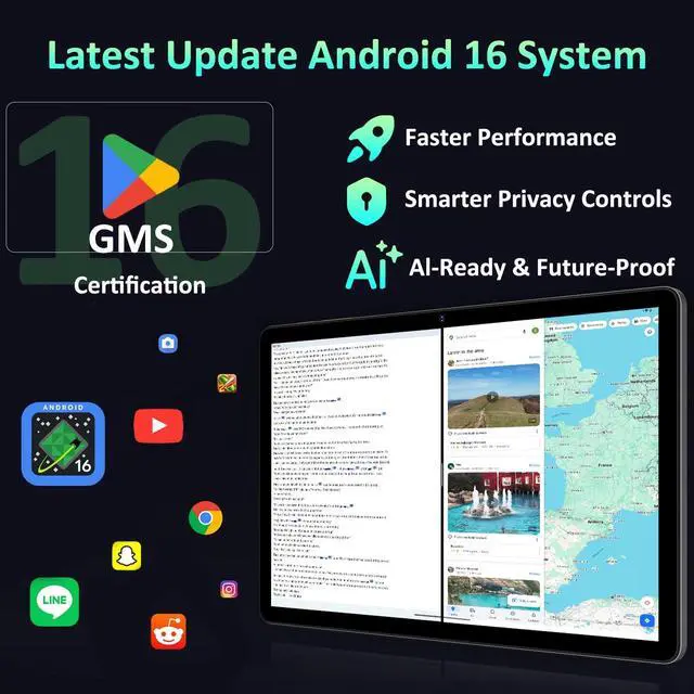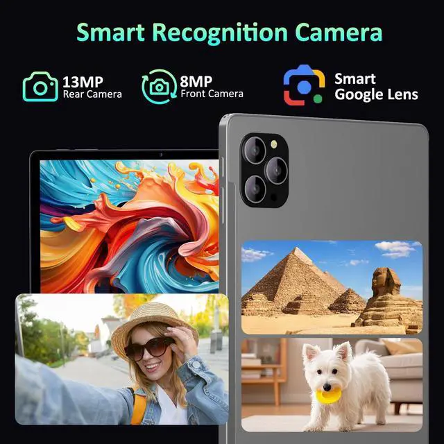 Run over 15 apps at once and store tens of thousands of photos or hundreds of HD movies effortlessly. ^^ [LongLasting 8000mAh Battery with PowerLock] The 8000mAh battery supports up to 7 hours of video playback, 6 hours of gaming, or 15 days standby. With Smart PowerLock technology, standby time can extend to 30 days for worryfree portability. ^^ [AIEnhanced Camera & HighSpeed Connectivity] Capture sharp photos with the 16MP rear camera featuring Google Lens object recognition and night mode. Stay connected with dualband 5G WiFi and Bluetooth 5.0 for fast, stable streaming and browsing.