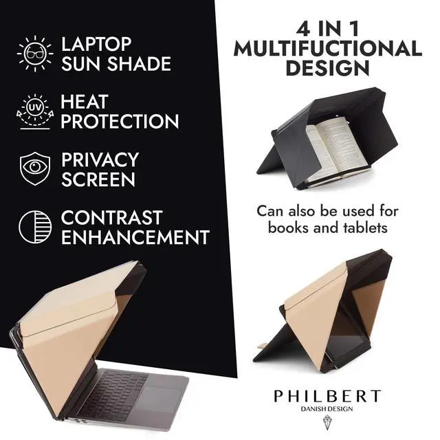 Philbert Danish Design 4-in-1 Laptop Sun Shade Lux Hood - Screen Shade, Privacy Screen, Heat Protection, Contrast Enhancement - Fits 12/13/14 Laptops, Self-Standing Cover with Pocket - Beige
