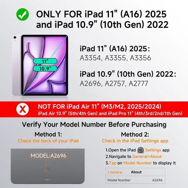 Your iPad: Designed exclusively for iPad A16 11th Generation 2025 (Models A3354/A3355/A3356) & 10th Generation 2022 (Models A2757/A2777/A2696). Please double-check your iPad's model number on the back cover to ensure a perfect fit ^^ 360 Rotatable Stand with 7