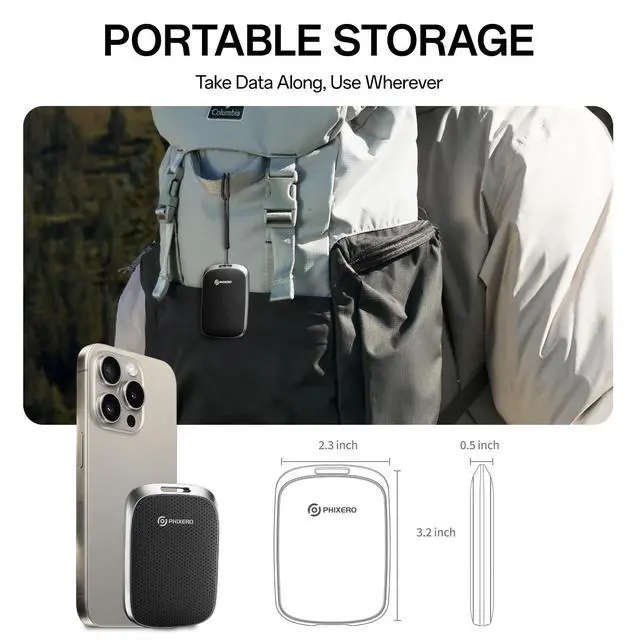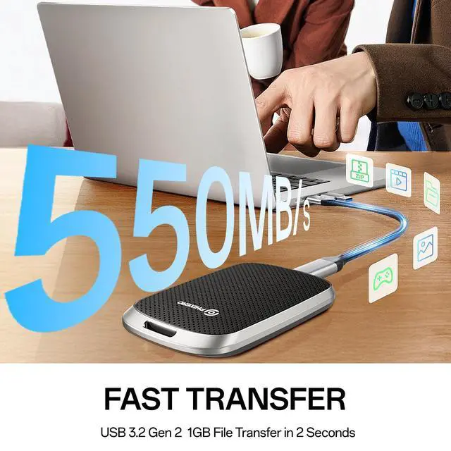 Extremely fast transfer speedP5PLUS External SSD supports continuous read speed of 550MB/s and write speed of 500MB/s. Don't waste a second waiting, transfer all heavy files in seconds, improve the efficiency of transferring/loading videos, photos, files and games. It allows you to get more things done in a short time. ^^ Sturdy and PortablePHIXERO P5PLUS External Solid State Drive adopts anti-drop, anti-vibration, anti-dust, and solid one-piece aluminum alloy frame with high strength and durability, making this portable hard drive keep the drive almost silent when running. The mini design makes it very convenient for you to carry and use.