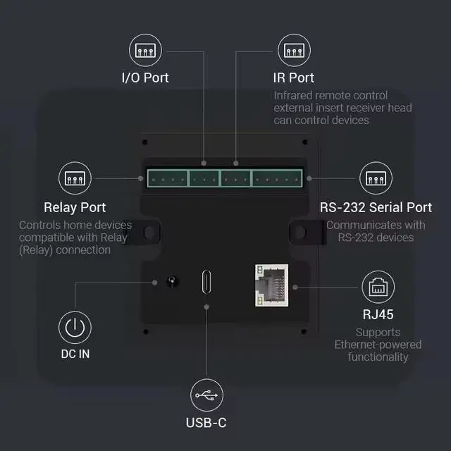 10.1 inch capacitive touch screen, 1280*800P resolution ^^ Android 14 OS, RK3576 processor, 4GB RAM +64GB ROM, ^^ Support WIFI 6E / 1000MB Ethernet /BLE 5.3 ^^ Support RJ45 POE power supply ^^ Support I/O, IR, RS-232, RS485 serial protocol supported ^^ Proximity Sensor, Automatically detects user presence and wakes the screen for touch interaction. ^^ 4 LED light bars inbuilt ^^ Inbuilt Light Sensor, Temperature and humidity sensor