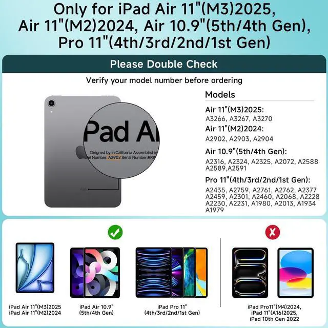 Compatibility: This keyboard case is exclusively designed for the following models: iPad Air 11-inch (M3, 2025) [A3266, A3267, A3270]; iPad Air 11-inch (M2, 2024) [A2902, A2903, A2904]; iPad Pro 11-inch 4th Gen (2022) [A2759, A2435, A2761, A2762]; 3rd Gen (2021) [A2377, A2301, A2459, A2460]; 2nd Gen (2020) [A2228, A2068, A2230, A2231]; 1st Gen (2018) [A1980, A2013, A1934, A1979]; iPad Air 10.9 -inch 5th Gen (2022) [A2588, A2589, A2591]; 4th Gen (2020) [A2072, A2316, A2324, A2331].
