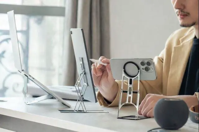 Majextand M is the thinnest Phone/Tablet/Switch stand at just 0.09 ( 2.3 mm), weighs just 2.6 oz, which can elevate your phones and tablets up to 12cm same height as an iMac screen. From 0 to 90, Majextand Ms massive tilt range and height adjusting segments provide 30 appropriate optimal angles and heights for different situations. With Majextand M, you can switch from vertical mode to landscape mode in seconds and view contents instantly in the most comfortable way possible. All you need to do is simply apply one patented adhesive docking sheet to each of your portable devices, and Majextand M can hold all of them, allowing you to easily switch between devices.
