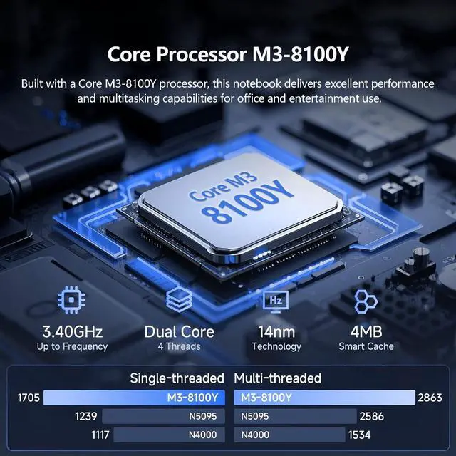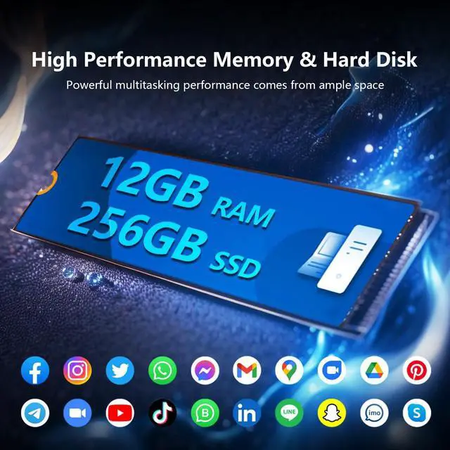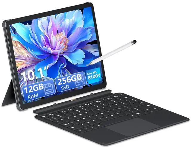 Efficient multi-tasking capabilityEquipped with M3-8100Y processor (acceleration frequency 3.4GH z) + 12GB DDR3 dual-channel memory, with 256GB solid-state drive, it can easily handle multi-tab web browsing and light creative design, providing better multi-tasking capabilities and better graphics processing performance. ^^ Mass StorageLaptop Computer comes with 12GB RAM, ensuring a smooth, lag-free experience whether you're working on spreadsheets, video calls or continuous viewing. With 256GB SSD, there's plenty of room for your documents, photos and apps. ^^ Audiovisual FeastEnjoy crisp visuals on the stunning 10.1 -inch HD touchscreen display (1280x800 resolution) with 300 nits of brightness.