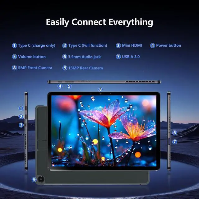 And dual cameras (1MP front, 2MP rear) for high-quality video calls and photography. Premium dual speakers provide immersive audio for movies and music. ^^ Unique DesignThis 2-in-1 laptop can easily switch between a fully functional laptop and a portable tablet. The lightweight body is suitable for demonstration and travel scenes. The stylus is precise, and the detachable backlit keyboard allows you to type efficiently in low light, easily meeting various work requirements. ^^ Full interface expansion and stable connection Equipped with a variety of interfaces, including Type-C*1 charging 12V2A *1, microHDMI *1, USB-A 3.0 *1, headphone jack *1, 4-segment 3.5 mm standard headphone jack *1, and full-function Type-C interface.