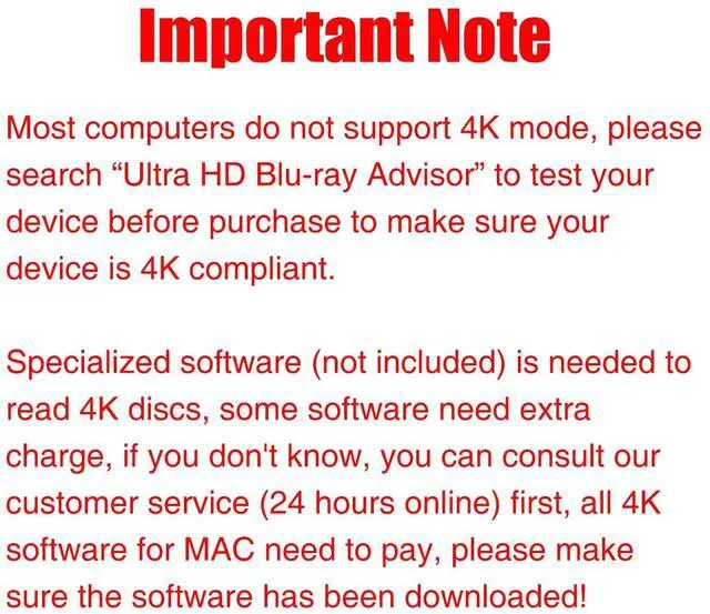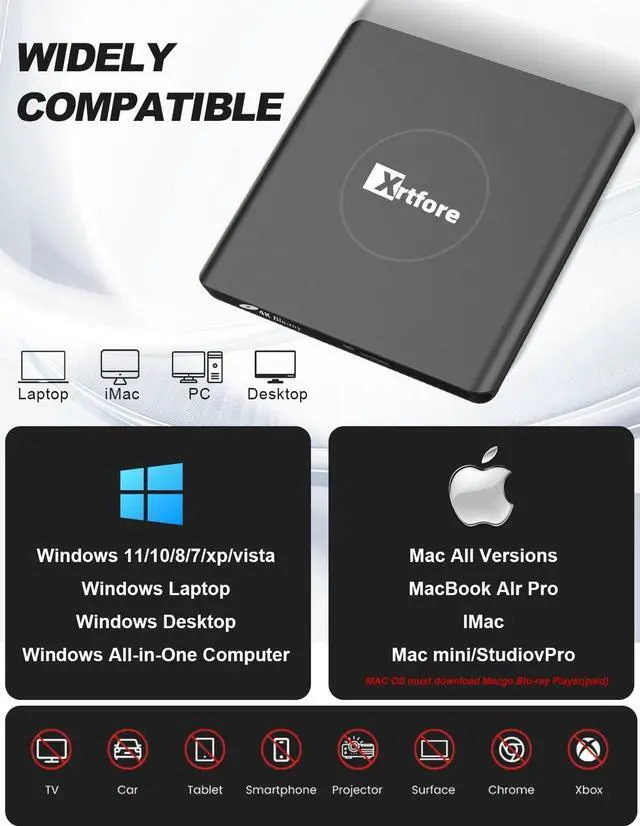 Pre-use InformationPlease make sure your equipment going through a test" Ultra HD Blu-ray Advisor " before purchase. When playing BDs, it is recommended to use the professional BD player 'PowerDVD10-19' (For Mac OS, Macgo Blu-ray Player (paid) is recommended). ^^ Portable and ProtectiveThis External Bluray CD/DVD drive is very slim and lightweight, skip-proof rubber pad prevents sliding on the desktop, with thicker protective carrying case, so you can easily carry in your laptop bag ideal for home, office, or anywhere you go. ^^ Wide CompatibilityThe 4K blu ray drive external is ideal for various devices, it compatible with Laptop Windows 11/10 PC Mac OS MacBook, you can use this blu-ray drive with almost all computer including MacBook Pro/Air, iMac, Windows laptop, and desktop PCs.