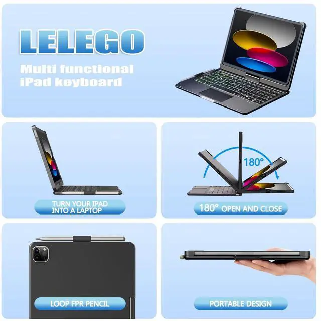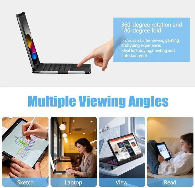 Enjoy browsing, designing, or drafting with unparalleled convenience. Easily lock the trackpad while typing by pressing fn+T key to avoid accidental touches, and press again to unlock ^^ Large Battery Capacity - With a built-in 500mAh large battery and efficient chip, our iPad Air 11 inch case with keyboard delivers 3x faster connection - giving you amazing iPad experience! Quickly recharge with the included Type-C charging cable, achieving a full charge in just 3 hours ^^ Multiple Viewing Angles - iPad Pro 11 inch case with keyboard supports 360 rotation and 0-180 flip, effortlessly adjusting to the most comfortable viewing angle.