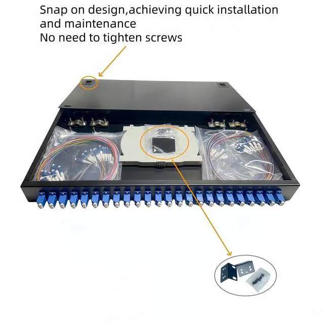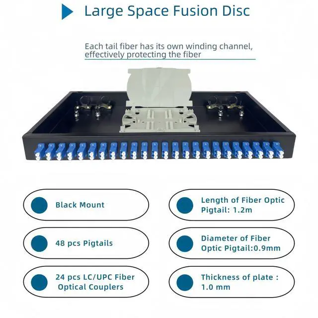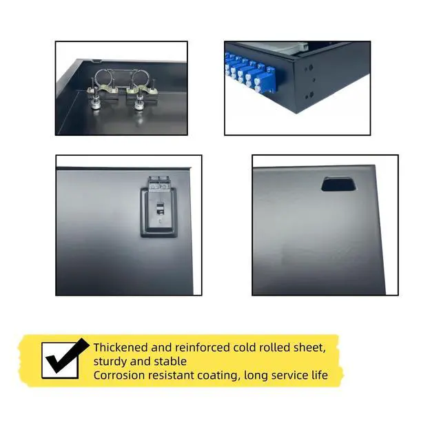 Complete 24 port fiber optic enclosure kit ready for immediate deploymentThis all in one solution includes pre installed pigtails and couplers saving valuable time on component sourcing and installation for your network upgrade ^^ Maximizes rack space efficiency with a high density 1U designEfficiently manage 48 fiber connections within a single rack unit ideal for core data centers and network aggregation points where space is critical ^^ Heavy duty cold rolled steel construction ensures long term reliabilityThe robust all metal chassis provides superior shielding and promotes better heat dissipation for stable performance in demanding environments ^^ Universal 19 inch standard rack mount design for seamless integrationThis panel fits all mainstream server cabinets and allows for quick tool less or simple screw installation by your IT team ^^ Precision engineered with UPC singlemode ceramic sleeves for optimal performanceGuarantees low insertion loss and high return loss maintaining signal integrity for long distance high bandwidth applications