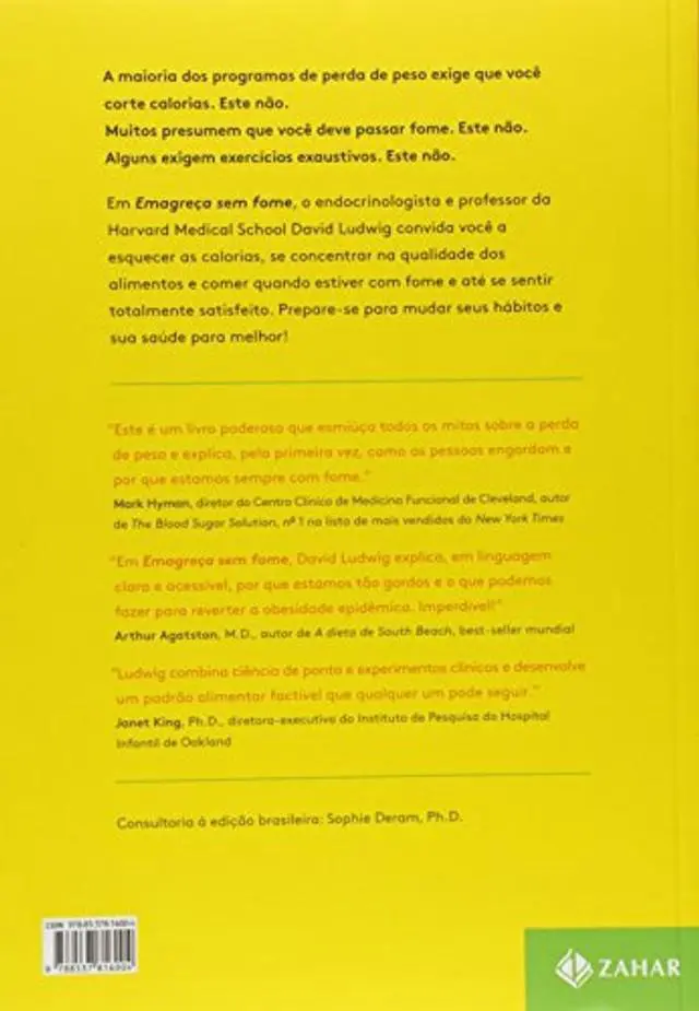 Esqueca tudo o que voce aprendeu sobre dieta. Experimente mais prazer em comer e uma sensacao de bem-estar muito maior. Neste livro, o renomado endocrinologista dr. David Ludwig propoe um metodo eficaz de emagrecimento, baseado em mais de duas decada s de pesquisas inovadoras. Emagreca sem fome ignora as calorias e se concentra em nossas celulas de gordura, as quais desempenham papel fundamental em definir quanto peso se ganha ou se perde. Dividido em tres fases e oferecendo planos de refeicoes, este programa revolucionario traz menus detalhados e receitas simples e deliciosas que qualquer um pode fazer.