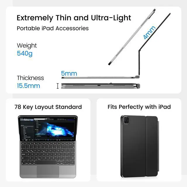 Adaptation Model- Only compatible with iPad Pro 11-inch(M5 2025 / M4 2024), models: A2836, A2837. Please confirm your iPad model before purchasing. ^^ Work anywhere, anytime- Turn iPad Pro M4 into a Mini Macbook, upgrade to laptop mode. This iPad Pro 11 keyboard case has strong portability, thin and light body, the whole weight is only 540g. make the work anywhere can be done easily ^^ 90 floating cantilever design- Upgraded new hinge design, this ipad keyboard case opening angle is large and balanced. The visual angle of this ipad pro 11 2024 keyboard case is more comfortable than ever, whether you use it on a desk or on your lap. Allows you to expand more ipad keyboard case usage scenarios ^^ Designed for comfort- The trackpad of this keyboard case for ipad pro 11 5th has smooth navigation capabilities, supports multi-touch gestures, and features a glass trackpad with haptic feedback and an aluminum alloy palm rest for an excellent touch experience ^^ More Functionality- The ipad pro 11 case with keyboard has a full row of functional shortcuts, can automatically sleep wake up the ipad, 7-Color RGB backlight as well as with scissor-structured keys with 1.4 mm key travel ^^ Front and back protective cases- Folds to provide front and back protection for iPad Pro 11 M4 wherever you go.