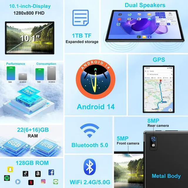 Latest Android 14 and Octa-Core CPU The android tablet is powered by the latest Android 14 operating system, which improves the underlying architecture to make the system smoother in use. It features a high-performance 2.0 GHz 8-core processor T606, which provides fast APP response and operation to easily meet performance requirements for work and play. ^^ 22(6 +16) GB RAM + Large Memory Storage The R900 Tablet comes with 22GB (6GB physical + 16GB virtual) RAM, which enables you to run small and medium-sized gaming software and work software with ease. With 128GB of built-in ROM and support up to 1TB TF card (not included), tablet provides ample space to store a large number of photos, videos, and documents.