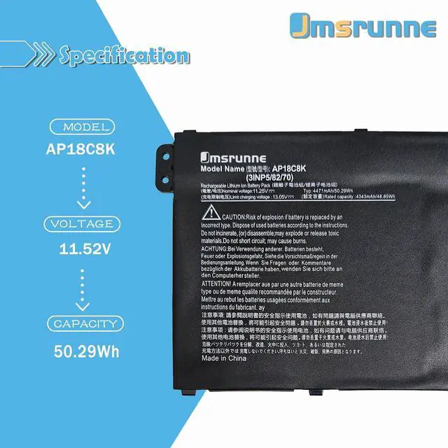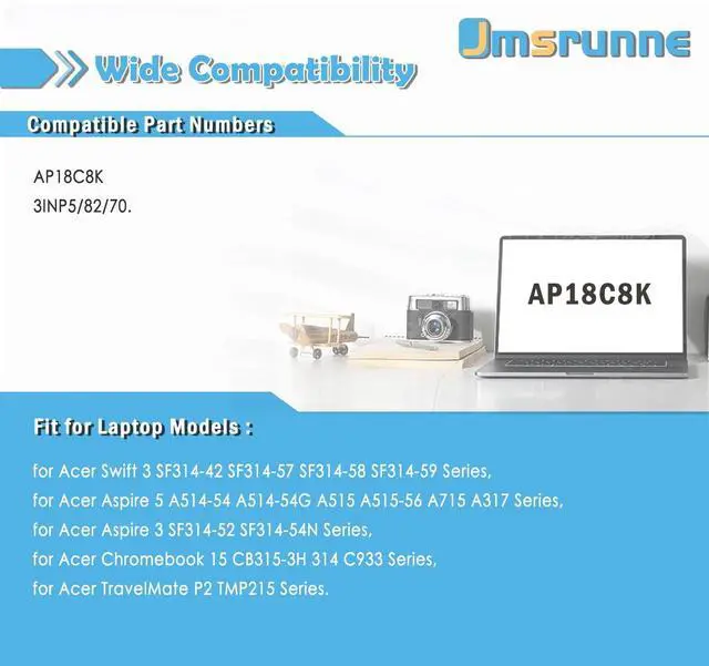 Purchasing Note: Due to the complexity of laptop battery models, you may not be able to accurately determine the model you need to purchase, Please open the back cover of the laptop to confirm the original battery model number ^^ AP18C8K battery Compatible laptop Modelsfor Acer Swift 3 SF314-42 SF314-57 SF314-58 SF314-59 Series, Aspire 5 A514-54 A514-54G A515 A515-56 A715 A317 Series, Aspire 3 SF314-52 SF314-54N Series, Chromebook 15 CB315-3H 314 C933 Series, TravelMate P2 TMP215 Series. ^^ Replacement Part NumberAP18C8K 3INP5/82/70. ^^ TipsIf the new battery is not recognized during the initial installation, please reinstall and check if the interface is fully connected. Discharge the new battery to 5% not 0%, then charge and cycle 3-4 times to wake up the new battery ^^ High qualityEvery battery has passed factory testing, grade A cells ensure fast charges, built-in circuit protection ensures both safety and stability. All items must be tested and at good condition before shipped. ^^ Customer Service <1>. 24 x 7 email support. If you have any problem with battery, please Contact us - in YOUR ORDER options click the contact seller.