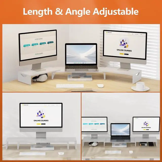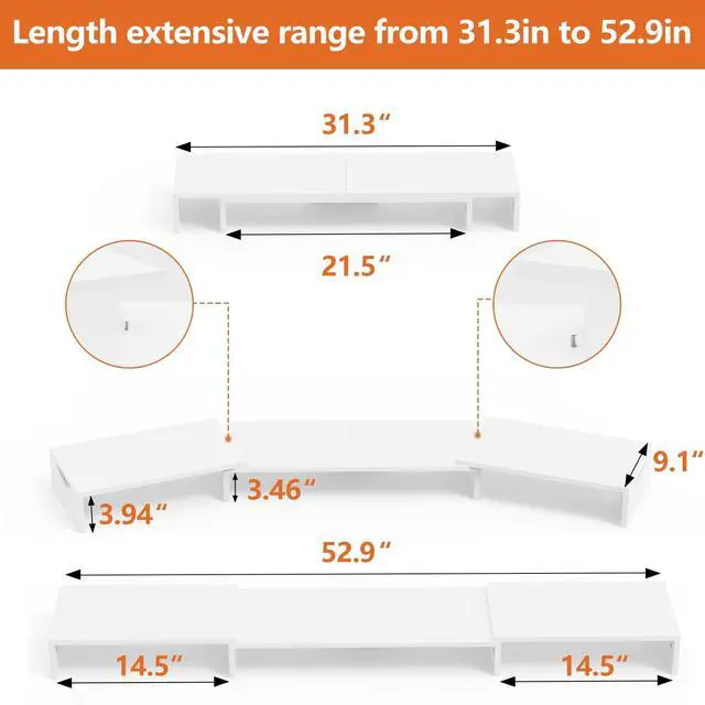 Length & Angle: The monitor stand riser length can be adjusted from 31.3 inches to 52.9 inches, and the angle can be adjusted +/-90 degrees, you can change the length and angle of your visual as you like. Helping you organize the desk reasonably, and find the most comfortable posture during long-time work, ease your neck and back. ^^ Extra Space for