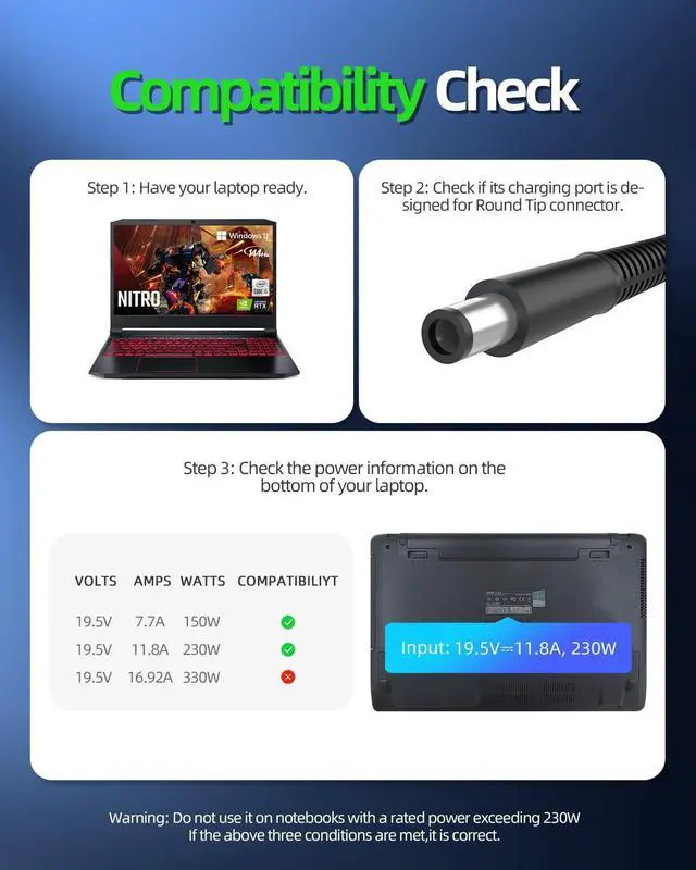 Safety - Certified and listed by UL, the US recognized safety standards, passed UL's stringent tests to ensure you and your devices' safety. ^^ Compatible with HP Zbook 15 G1 G2 17 G2, Z2 Mini G4, Omen 17 Omen X 2S 15, 693706-001 693714-001 925141-850 L58062-001 TPN-LA10 TPN-DA12 Laptop. Only for amperage equal or less than 11.8A. ^^ Guarantee - Within 30 days of purchase, we offer a no-questions-asked replacement guarantee and a 360-Day-Quality-Guarantee by the Manufacturer. ^^ Output Max - 19.5V 11.8A 230W. Only Compatible with 7.4 X 5.0 mm Input Volt Range - 100-240V ^^ Package - 1 X power cord.