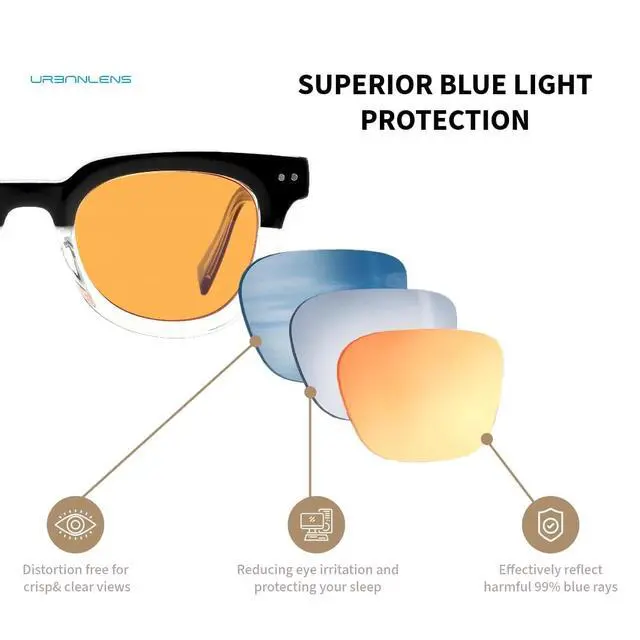 SAFELY USE ELCTRONIC DEVICES: Safely use computers, tablets, and phones after dark without disrupting your sleep quality. ^^ Improved Sleep Quality - Numerous studies have shown that prolonged exposure to blue light can slow or stop the production of melatonin, leading to sleep disorders and an increased risk of damage to the retina, cataracts, and macular degeneration. Our blue light computer glasses incorporate anti-glare high-efficiency blue light filters, reducing eye irritation and protecting your sleep, so you can enjoy your digital age with peace of mind while taking care of your eyes. ^^ Experience Unwavering Confidence and Assurance - With our 365-day unconditional replacement and refund service, you can shop with complete peace of mind. Join the ranks of thousands of delighted customers who have made UrbanLens blue light glasses an indispensable part of their daily routines. Whether at work, enjoying leisure time, or immersing yourself in gaming adventures, these glasses have become trusted companions, providing you with healthier eyes and a life with enriched sleep quality.