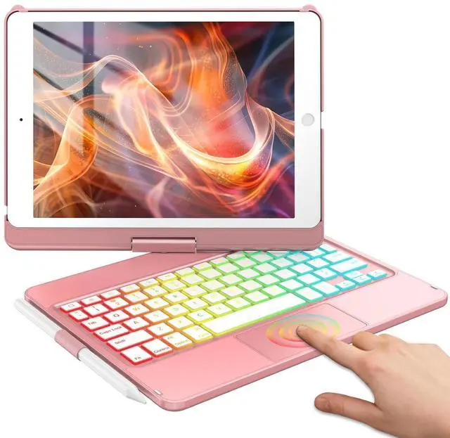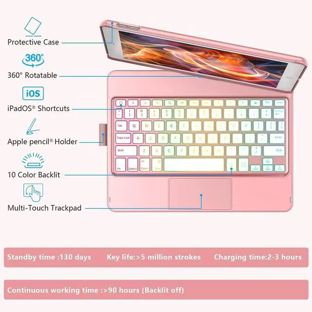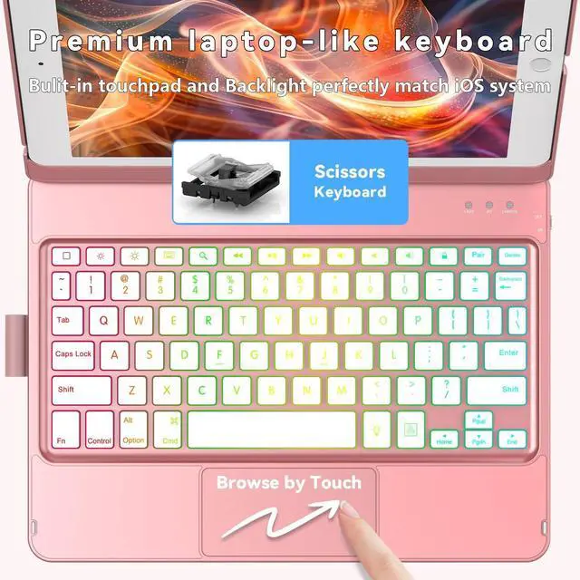 Generation/8th Gen/7th Gen: One of the standout features of our keyboard case for iPad is the integrated multi-touch trackpad. With a variety of trackpad gestures, you can turn your iPad into a highly efficient laptop, making tasks like swiping and scrolling a breeze. This functionality opens up new ways to interact with your iPad, enhancing productivity and user experience while allowing you to click and swipe through content effortlessly. ^^ For iPad 9th/8th/7th Generation