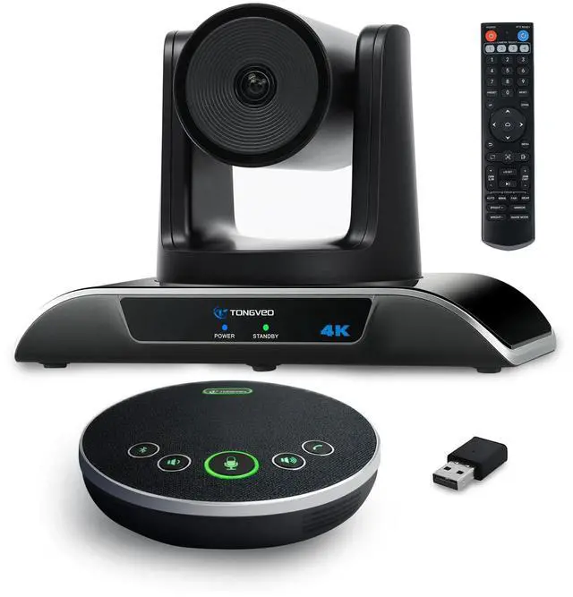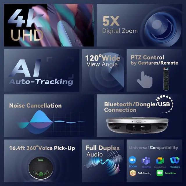 AI Function Upgrade: The Gesture function can be ON/OFF in the Menu and Auto-tracking can also be ON/OFF by the remote control. ^^ multi- connection (USB cable and Dongle), built-In 2400mah battery for 6-8 hours long standby, full duplex audio design with ultra clear sound quality, built-in 2 stereo microphones with noise reduction, 16.4 ft/5m audio pickup range, LED indicator & compact design, USB-C/Dongle plug and play, high compatibility. ^^ & This 4K PTZ Camera and Speakerphone kit can work with most video conferencing software including Zoom, Skype for Business, Polycom, Microsoft Lync, WebEx, BlueJeans, Facebook Messenger, and more. Compatible with Windows, Mac OS, and Chrome OS.