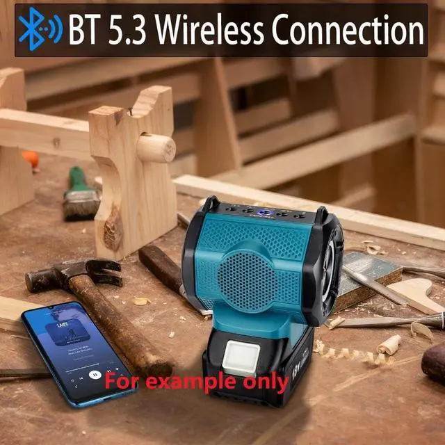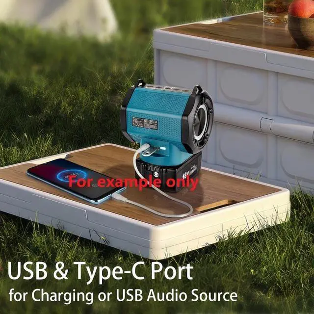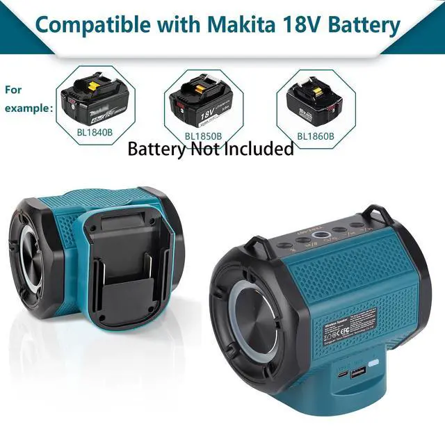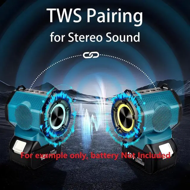 - This wireless Bluetooth speaker for job site compatible with Makita 18V batteries (Battery Not Included). BATTERY SOLD SEPARATELY - This is a speaker body only ^^ - This battery powered Bluetooth speaker equipped with Bluetooth 5.3 for fast pairing and stable connection. The portable speaker also supports USB audio for automatic playback of songs from a USB flash drive without the need to connect a Bluetooth device. ^^ - 360 TWS Pairing. You can pair two speakers together to enjoy true wireless stereo sound. ^^ - Bluetooth party speaker features a dynamic and colorful light show that can be easily customized to suit your preferences by simply pressing the light button.