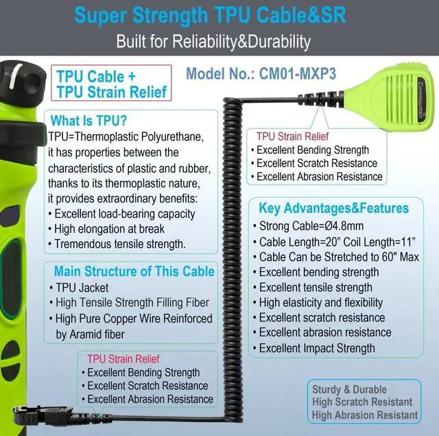 Strength Cable Module: TPU (Thermoplastic polyurethane) cable bring super bending strength, abrasion resistance and scratch resistance; Cable internally reinforced by high tensile strength fiber and Kevlar fiber bring stronger tensile strength; Strain relief structure made of TPU rubber bring stronger bending strength and longer lifespan.