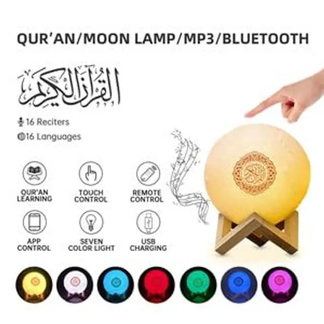 APP Quran SpeakerImprotant Notice: A new APP have beed activated at this moment, just search Koran Player in the app store or scan the new QR code as picture to download the support app to play the quran surah. Lighting and Learning Complete Quran SpeakerBluetooth speaker designed specifically for Muslims, with a built-in 8GB TF card, by the famous imam (supported by 16 famous reciters) and 16 different languages translation. Playing the Quran word by word, and easy to learn the Quran by this way. This portable Quran speaker is not just a simple Bluetooth speaker/wireless music player/APP CONTROL/hands-free speaker phone/bedside lamp, it is a touch control color-changing lamp (Touch the top Metal point to change) APP interface is controlled graphically. You can directly scan the QR code on the outer packaging or the manual to connect; (You can also search for'quran speaker' in Google Play to download the application, open the application, and click "Bluetooth Mode" to successfully search and match the Bluetooth connection, And set the latitude and longitude after setting). Connect and click "Mode"You can download Bluetooth Islamic music and play it via the. Support the entire chapter of the scripture, or play the entire page.