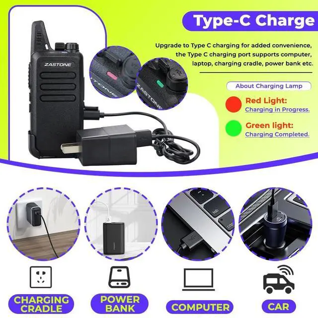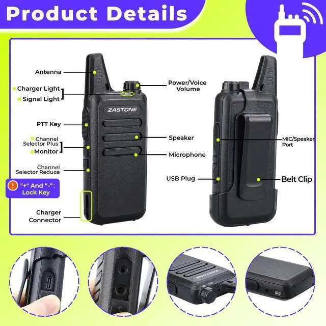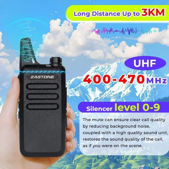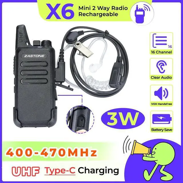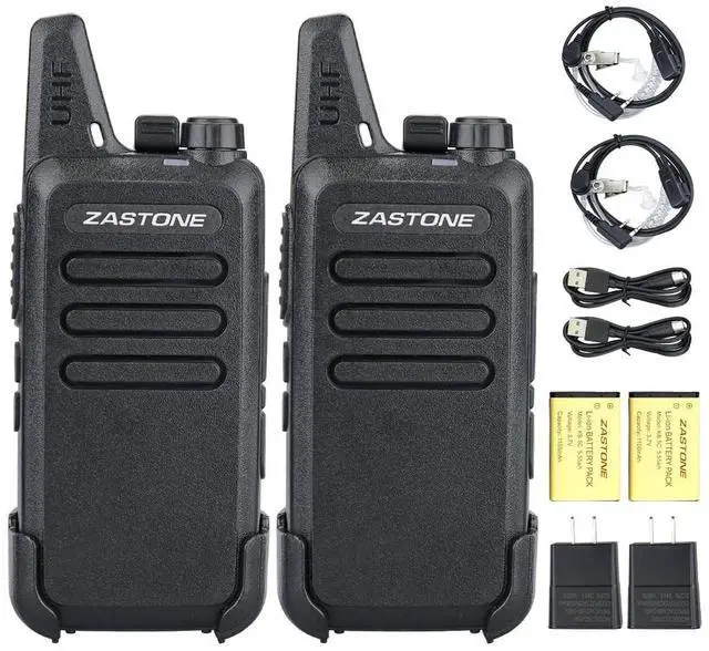 Small and lightweight; 9.6 * 5.5 * 2.2 cm/ 3.7 * 2.1 * 0.8 inches; compared with most large and heavy walkie-talkies; adopts a lighter and thinner compact design; allowing you to carry it easily and enjoy more comfortable communication ^^ 3W Hands free walkie talkie; loud and clear sound quality; VOX function allows you to speak directly to the microphone of the walkie-talkie to send a call without pressing PTT ^^ Frequency range is UHF 400-470MHz; 16 pre-programmed channels; you can program any of 50 CTCSS tones and 105 CDCSS tones on each programmed channel ^^ With 1000mAh Li-ion battery; can be used continuously for several hours; enjoy smooth communication with your partner ^^ Portable FRS two-way radios; license-free; Zastone X6 walkie talkie can work with other FRS radios with 16 channels on the same channel and CTCSS